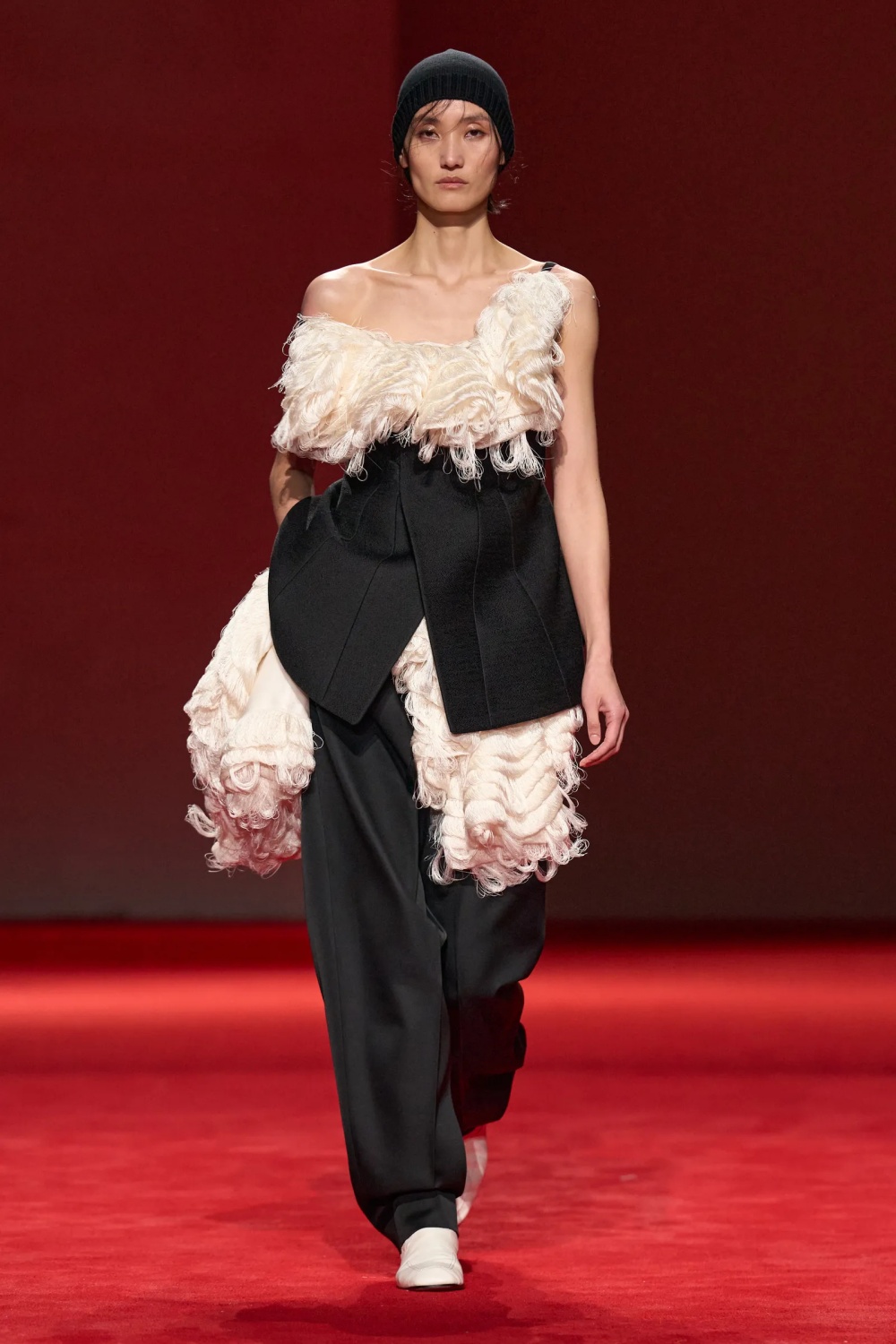Bottega Veneta 2026秋冬系列以“流動之美”為內(nèi)核,延續(xù)Louise Trotter執(zhí)掌下的本質(zhì)主義探索。本季從雕塑感廓形西裝出發(fā),于利落結(jié)構(gòu)與感性材質(zhì)間構(gòu)建張力。仿皮草、雕花天鵝絨、品牌經(jīng)典的Intrecciato編織與流蘇創(chuàng)新融合,演繹“皮革世家”的實驗精神。